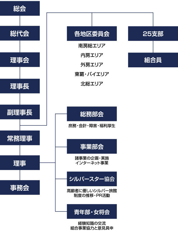 全旅連を上部組織にもち、全国47都道府県に存在する団体の、いわば“千葉県支部”です。法律に基づき、千葉県知事の認可を正式に受けています。「千葉県旅館ホテル組合」が略称です。