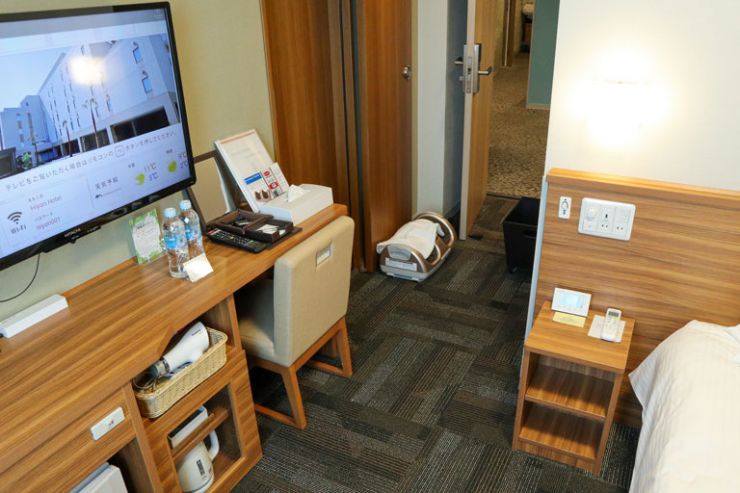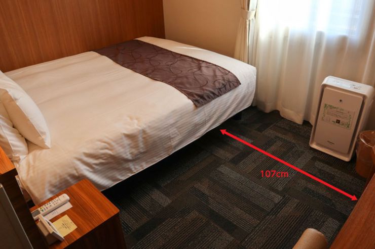 客室内はカーペット敷き。靴を履いたまま進入します。ベッドと反対側の壁側には天板下までの高さ67cmのデスクあり。ベッドからデスクまでのフリースペース幅は約107cm。