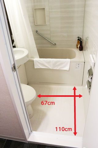 客室入口から室内へ進入し、左にユニットバス・トイレあり。ドアは開き戸で、客室入口側に開く(右開き)、開口幅60cm。ドア下部分には段差があり、客室より5cm、ユニットバス内より2cm、段差部分奥行13cm。便座前スペース目安67cm×110cm。