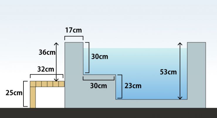 浴槽外側の高さ約61cm(足元に高さ25cmの踏み台あり)、浴槽の内側に奥行30cmの階段1段あり。長方形の浴槽サイズ目安約120cm×242cm。